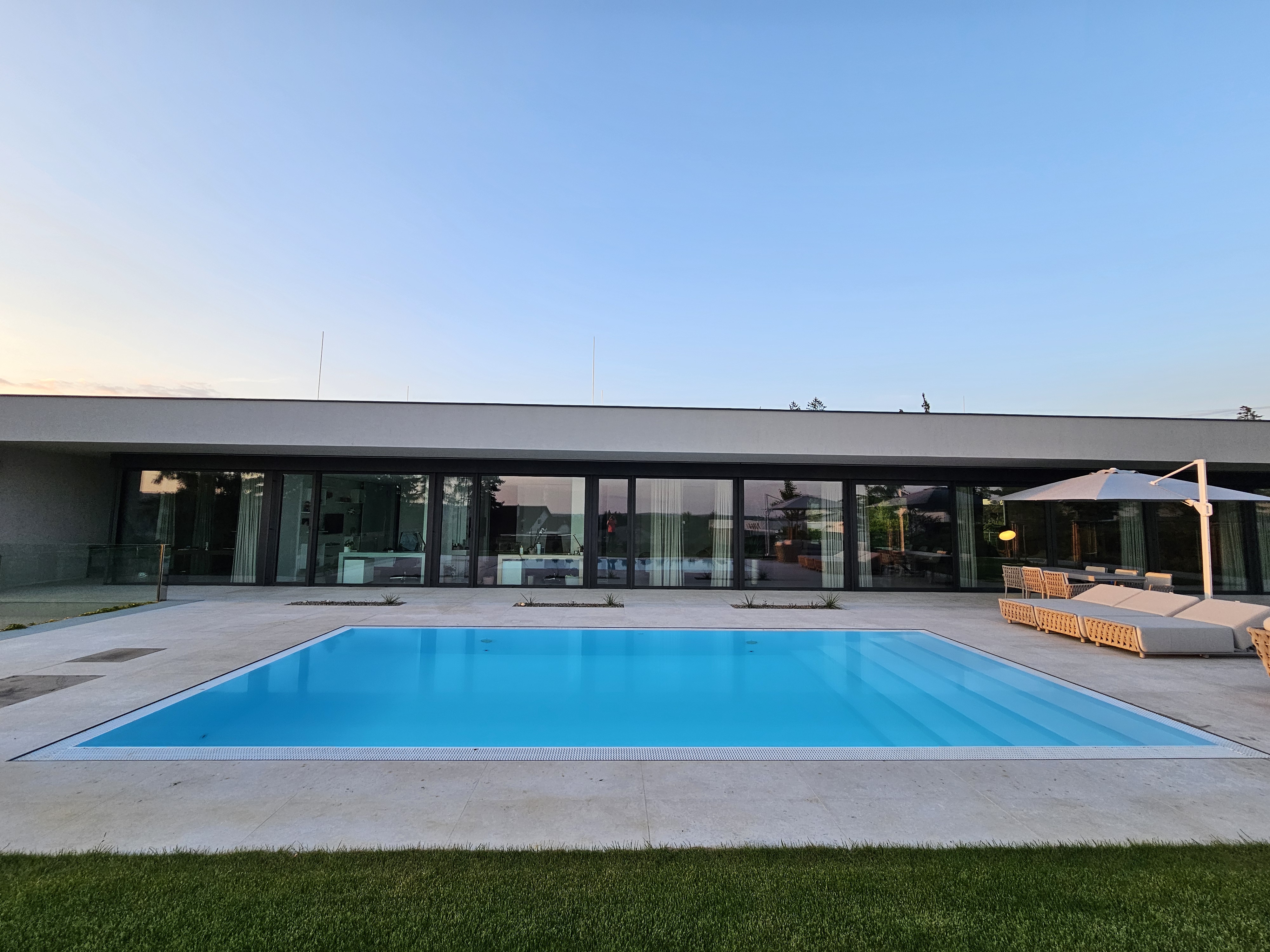 Dnes bazén využívám téměř denně, a to i v zimních měsících – ohřívám vodu na 36 °C i při venkovních teplotách 10–12 °C. Bílý přelivový bazén v kombinaci s bílým travertinem působí esteticky výjimečně. Přes skleněné zábradlí vidím na hory, koupání při západu slunce je opravdový zážitek. Vizuálně i funkčně jde o výjimečný prvek domu.